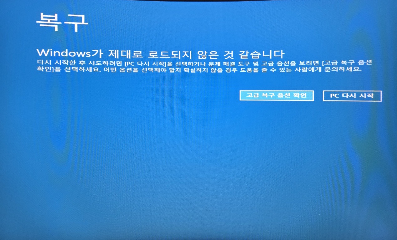 며칠 전, 갑자기 컴퓨터를 켰더니 ‘복구: Windows가 제대로 로드되지 않았습니다’라는 메시지가 떴다.