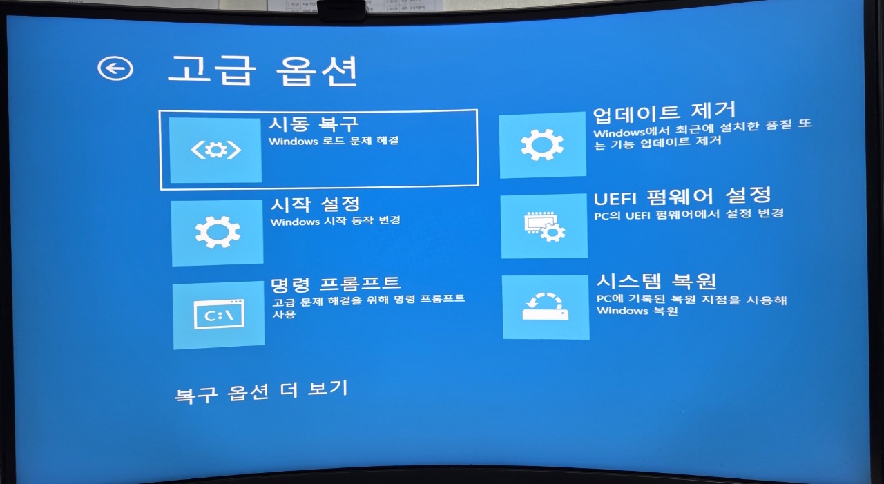 • 문제 해결 화면에서 [고급 옵션] → [시동 복구] 클릭